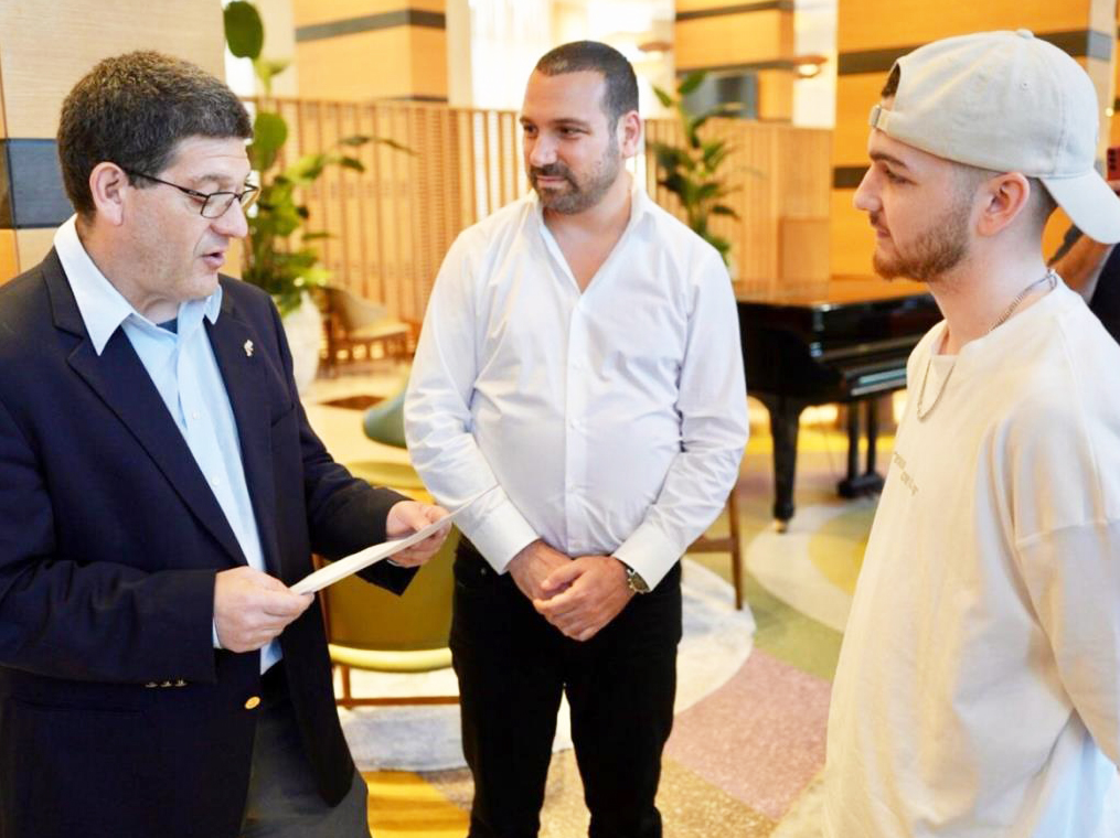 Surrounded by the Kuperstein family and Holon Mayor Shai Keinan, Jeff handed Bar a check for $8,000 at the Kfar Maccabiah Hotel in Ramat Gan, Oct. 31.